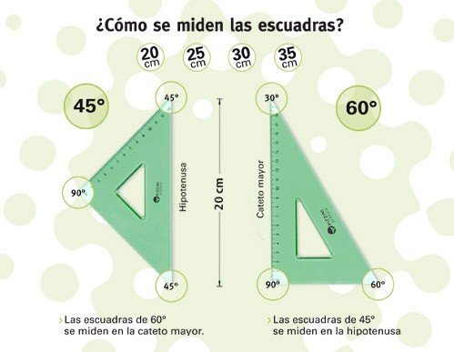 Set de 2 escuadras de 30cm de largo , una de 45° y otra de 60°.