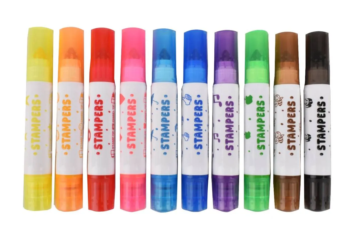 10 marcadores de colores doble punta para diseñar y decorar tus creaciones. De un lado marcador y del otro sellito!
